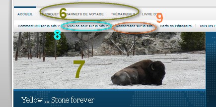 6 - Les différents articles sont dans les rubriques : "Le Projet", "Carnets de voyage" et "thématiques". Ils sont accessibles à plusieurs endroits sur l'écran d'accueil et les autres écrans. 7 - Les 5 derniers articles publiés font la Une de la page d'accueil. Un récapitulatif des derniéres mises à jour (8) est également proposé. Cela vous permet de ne rien rater du périple. Il est possible de trouver également tous les articles à partir de la saisie d'un mot (9).