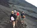Et nous voilà partis à la suite du guide et avec d’autres touristes sur les pentes du volcan. Et c’est vrai que le chemin raide et pavé du début est assez difficile. Les chevaux sont derrière nous, les gamins insistent, ils guettent une défaillance, un souffle coupé … mais non, nous ne craquerons pas ! Le chemin passe dans la forêt et la verdure et c’est bizarre car on a l’impression que les pentes n’ont pas connu de coulée de lave depuis bien longtemps alors que nous nous attendions à trouver un volcan actif et que c’était d’ailleurs pour ça qu’on était venu.Des chiens qui nous suivent maintenant ont remplacé les chevaux que l’on croise quand même de temps en temps, au cas où ! C’est à un détour du chemin que l’on tombe sur le vif du sujet : il y a devant nos yeux ébahis 2 grands cônes volcaniques dépourvus de toute végétation. Un des cônes paraît inactif, des baraquements y sont d’ailleurs installés, et l’autre plus imposant laisse échapper une colonne de fumée grise et dense. La chose la plus intéressante est une sorte de protubérance basaltique sur l’un de ses flancs où l’on voit distinctement une bouche vomir des torrents de lave liquide. Et il ne fait pas encore nuit ! Plus tard dans le noir, le spectacle sera lumineux et grandiose, mélange de rouge et de feu. La grimpette sur le cône actif commence alors dans un éboulis de cendres et la progression est plus lente. A chaque pas la chaussure s’enfonce et glisse (et pas vraiment vers l’avant, si vous voyez ce que je veux dire !). Mais au fait, où va-t-on ? On ne va pas quand même voir de plus près à quoi ressemble de la roche en fusion ? (D’autant que les torrents se transforment assez rapidement en avalanche de matières incandescentes quand la pente est plus raide). Et bien oui, on y va ! Et à grande enjambées, monsieur ! La fatigue a disparue, la gloire est proche. On traverse par moment des coulées refroidies de matière plus visqueuse qui laisse des amas de roches coupantes. On ne voit plus les chevaux (trop raide), les chiens sont toujours là (pourquoi ?). C’est surement pour se chauffer la couenne car maintenant que nous longeons une petite crête basaltique, des bouffées de chaleur sortent du ventre de la terre. Plus loin, c’est plus de la grimpette mais plutôt de l’escalade, les rochers sont coupants, les plaques sont instables et cassantes, la chaleur augmente, il commence à faire nuit et nous n’avons pas tous une lampe torche. Un des gars du groupe parti en sandales abandonne, il a bien fait, il aurait pu se brûler les pieds ! Et nous, encore heureux d’avoir acheté des bâtons aux gamins, même au prix fort ! On se rend compte bientôt que les plaques et les roches en question sont tout juste fraîchement refroidies. Dessous à quelques centimètres la matière est encore en fusion et des fissures et crevasses nous montrent clairement cette consternante réalité. A quelques mètres du but notre guide nous abandonne et se barre en direction des coulées (peut-être pour un repérage ?). Il nous fait ensuite des signes de la main pour nous montrer vaguement le chemin à suivre. Ramy en éclaireur le remplace avantageusement en nous éloignant d’une plaque instable et fragile tout près de la lave. Nous sommes maintenant au contact des torrents qui s’écoulent en un long fleuve tranquille. Le rayonnement de chaleur est quelquefois insupportable, on s’amuse à mettre nos bâtons et à lancer des mashmallows dans les ruisseaux de feu; ils s’enflamment instantanément. Il fait maintenant nuit noire et c’est magique, on rigole, on plaisante, on crie, on est tous des gamins, des illuminés ou des dieux. Quelque uns iront même jusqu’à se rapprocher tout près de la bouche du volcan au risque de se brûler les moustaches. Nous n’avons pas vu le danger (bien réel pourtant), le guide non plus d’ailleurs, mais il ne s’est rien passé de méchant et je pense qu’il n’y a jamais d’accident grave. Il faut partir maintenant, et même sans lumière la descente paraît plus facile. Sur le chemin en nous retournant nous contemplons ce spectacle époustouflant de la nature, les coulées, les chutes de roches en fusion et le cratère principal qui s’énerve un peu et laisse s’échapper des fontaines de lave. En bas notre chauffeur nous attend, on boit des sodas bien frais et bien mérités. Votre reporter préféré vous a même recueilli quelques impressions à chaud de vulcanologues en herbe : Ramy « C’est une expérience unique et exceptionnelle à faire au moins une fois dans sa vie ». Willy « Un orgasme terrestre duquel né un flot torride infernal et infini qui s’en va s’écouler dans la vallée encore assombrie » Clara « L’une des choses les plus extraordinaires que j’ai vu dans ma vie » Carole « Une ascension difficile et parfois dangereuse, mais un spectacle aussi grandiose, ça se mérite ! » Audrey « Chaud, très chaud. Beaucoup d’adrénaline ! » Luc « Les mains qui tremblent, les yeux qui s’embrassent »