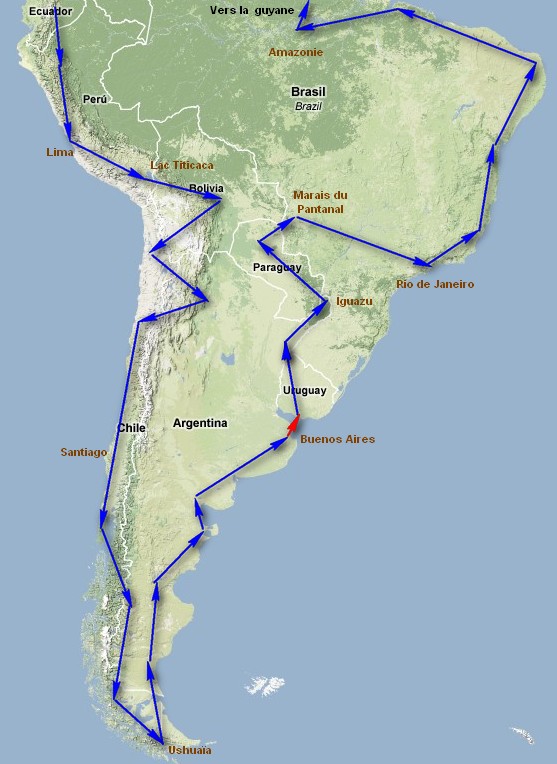 mais nous ne pouvions laisser de côté New York et le Québec dans le nord (aussi car l'achat des voitures était plus simple dans la partie Canadienne francophone). Dans le sud, on s'est aussi dit que l'Argentine et le Brésil ne pouvaient être evités. Ca donne alors un parcours un peu ambitieux notamment concernant le kilométrage. Par contre, si nous le respectons, cela nous promet beaucoup de belles choses à découvrir. Et pourquoi ce parcours, et pourquoi ce voyage ? surement l'envie d'un road trip à l'échelle d'un continent et le seul à peu près praticable, excepté l'Europe, est le continent américain. Il est d'autant plus intéressant qu'il offre tous les contrastes, du désert jusqu'à la forêt équatoriale, des montagnes et glaciers aux mers turquoises, des habitants hyper occidentalisés aux tribus originelles. L'idée est venue un soir comme un défit, peut être parce que Willy n'était jamais aux RDV à l'aéroport pour les précédents voyages Le parcours + la voiture apporte son lot de difficultés :